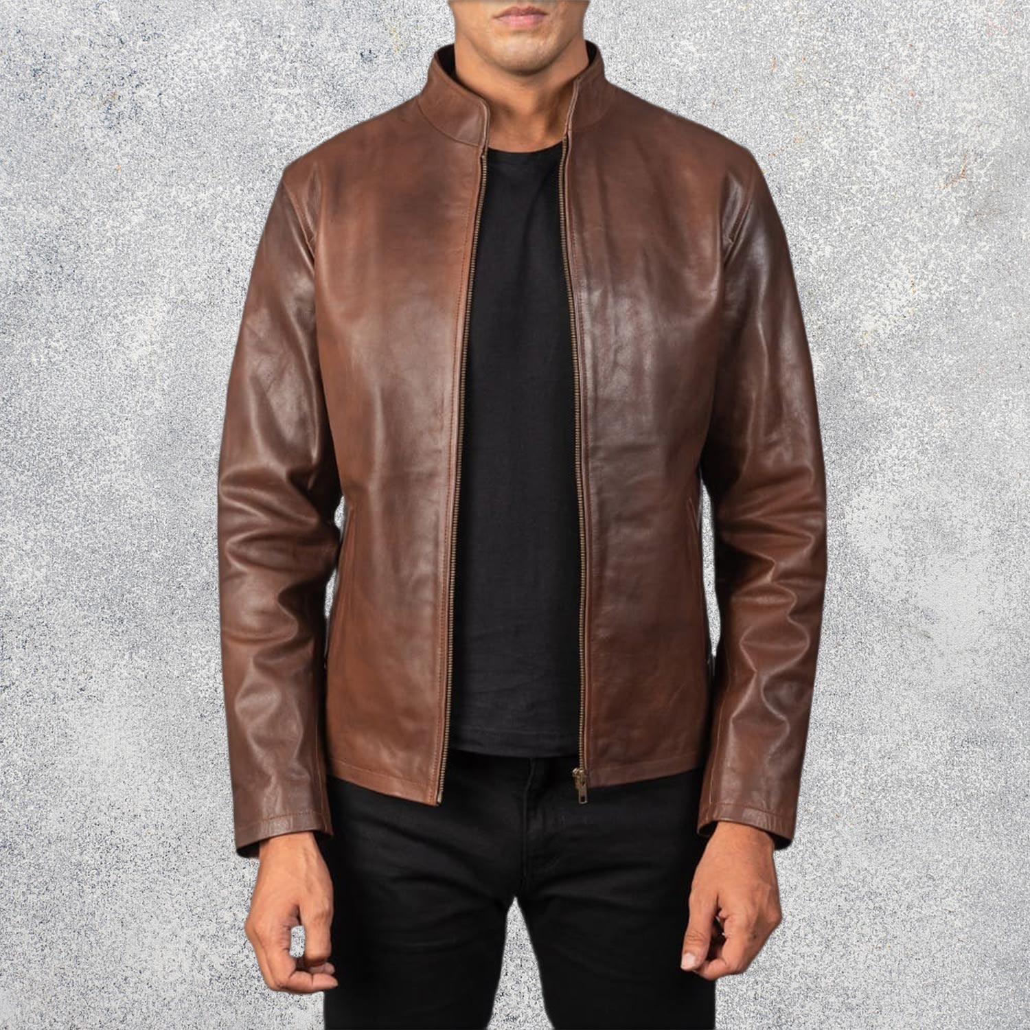 The Alex Brown Leather Biker Jacket combines rugged durability and sleek style, made from premium pull-up cowhide leather, with a band collar, zipper closure, and open hem cuffs for a bold, timeless look.