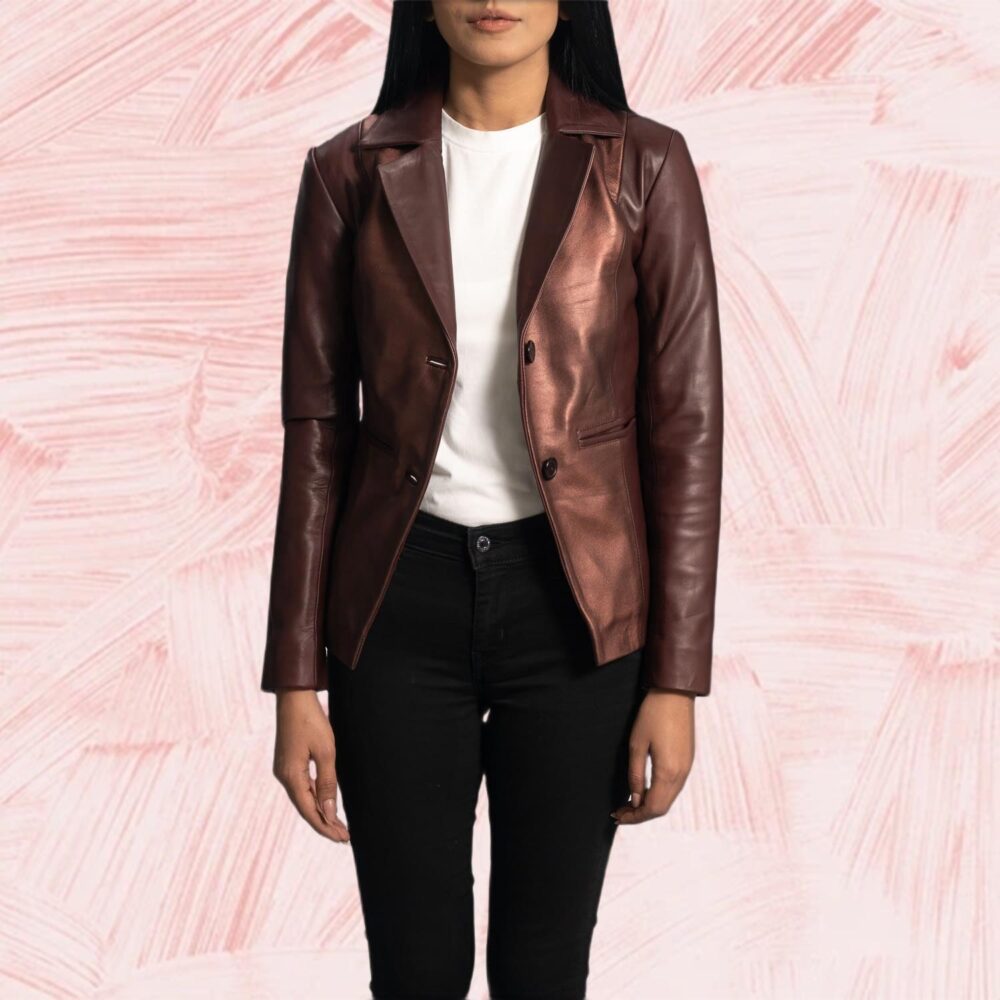 1 review for Astrid Metallic Maroon Leather Blazer for Women