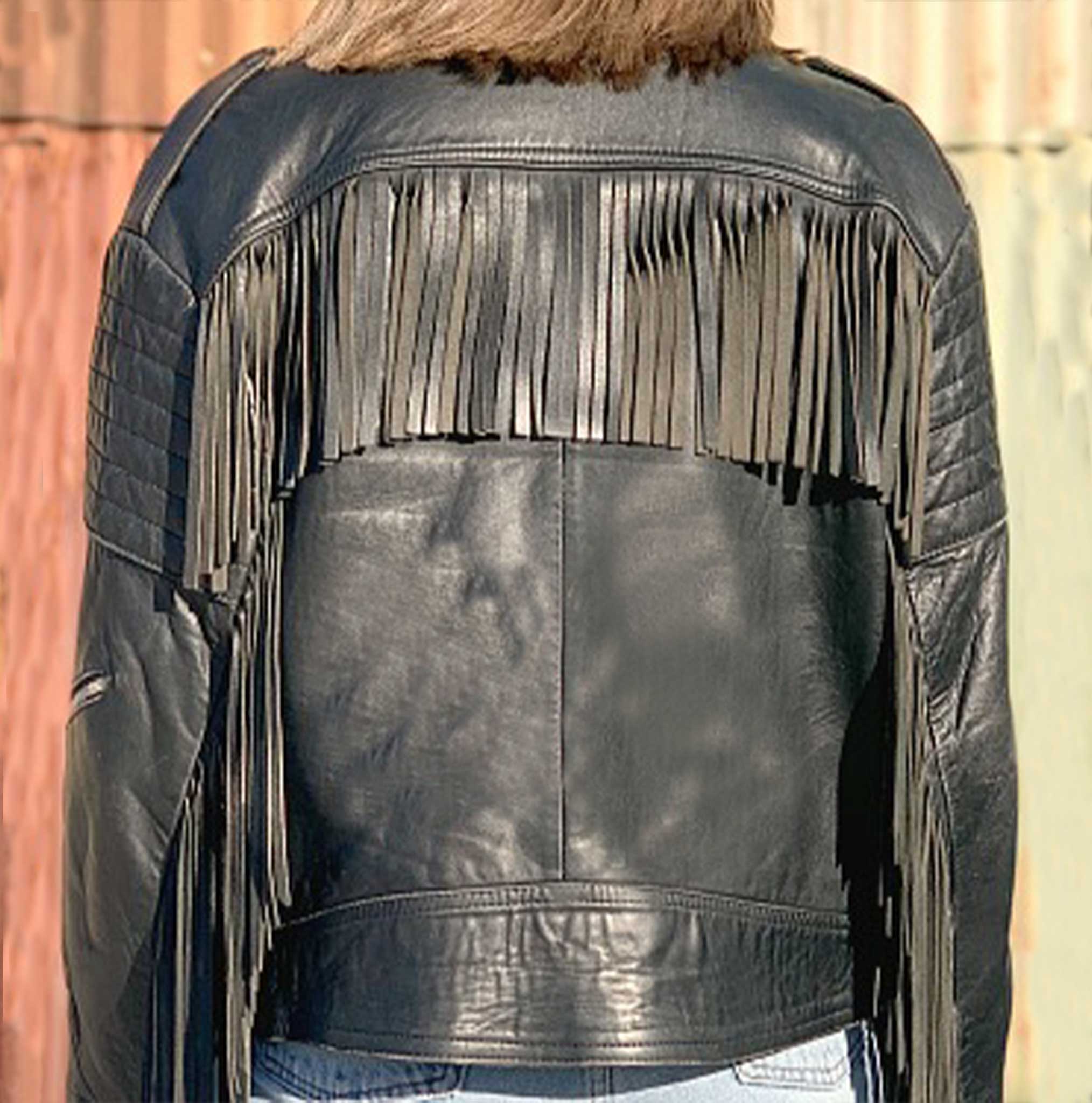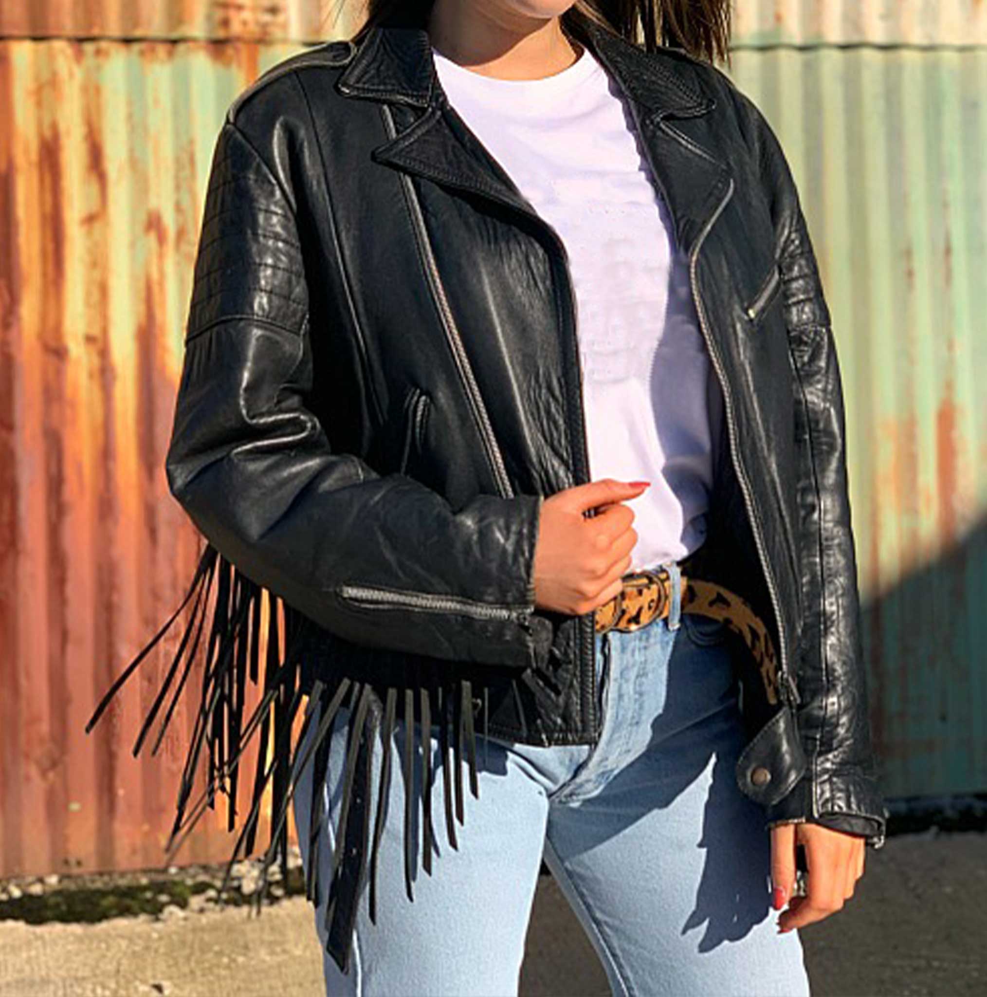 Introducing Whiskey Siren, the ultimate Black Fringe Tassel Vintage Leather Biker Jacket reworked and customised for bold fashion lovers. This unique vintage biker jacket combines authentic 1980s motorcycle construction with Western-inspired fringe detailing along the sleeves and body, creating a jacket that is both functional and unforgettable.