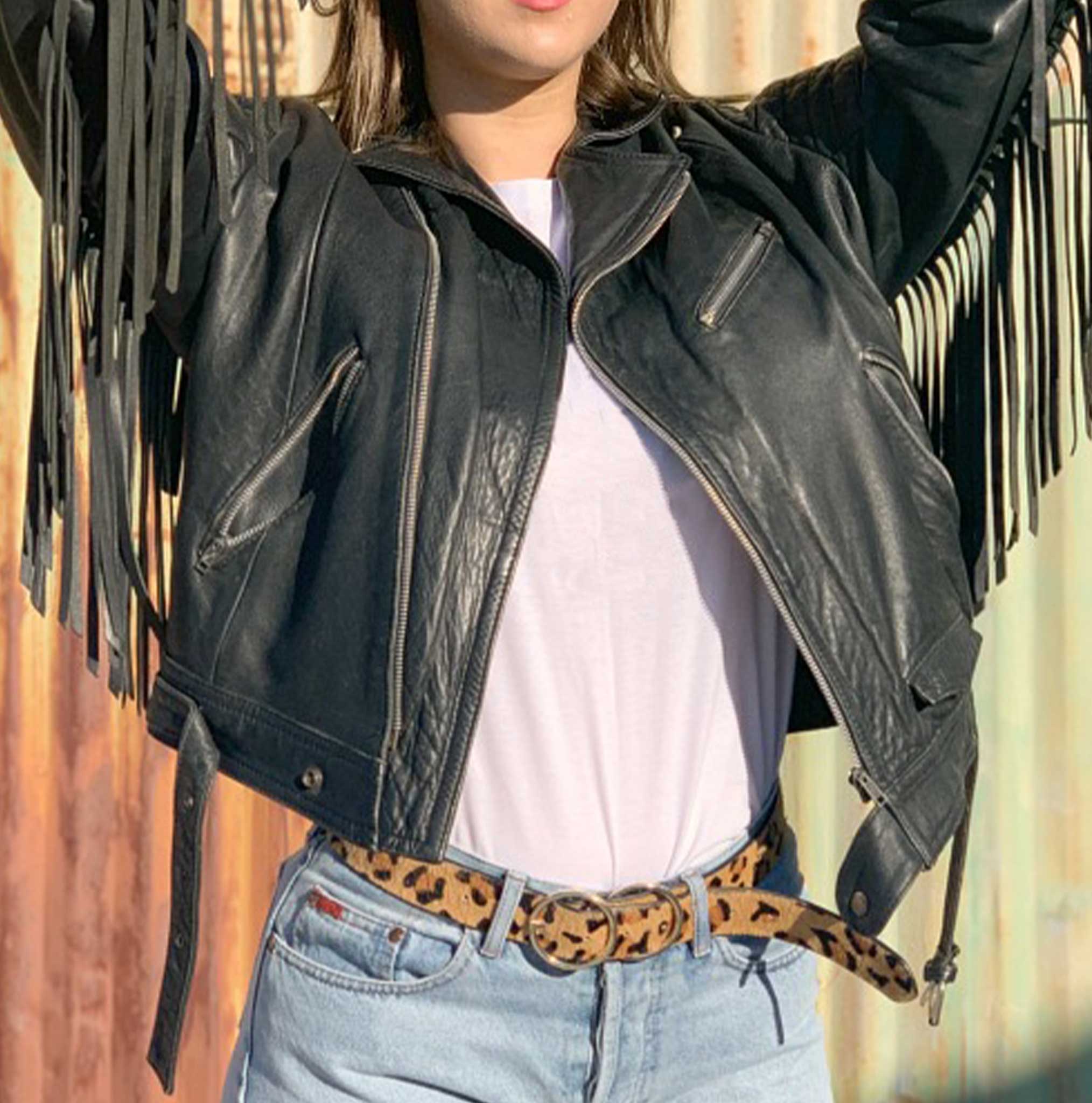 Turn heads with Whiskey Siren, a one-of-a-kind women’s black fringe tassel vintage leather biker jacket. Crafted from 100% genuine leather and fully lined for comfort, this customised 80s vintage biker jacket features dramatic fringe tassels, shoulder epaulets, motorcycle protection paneling, multiple pockets, and an adjustable belt.