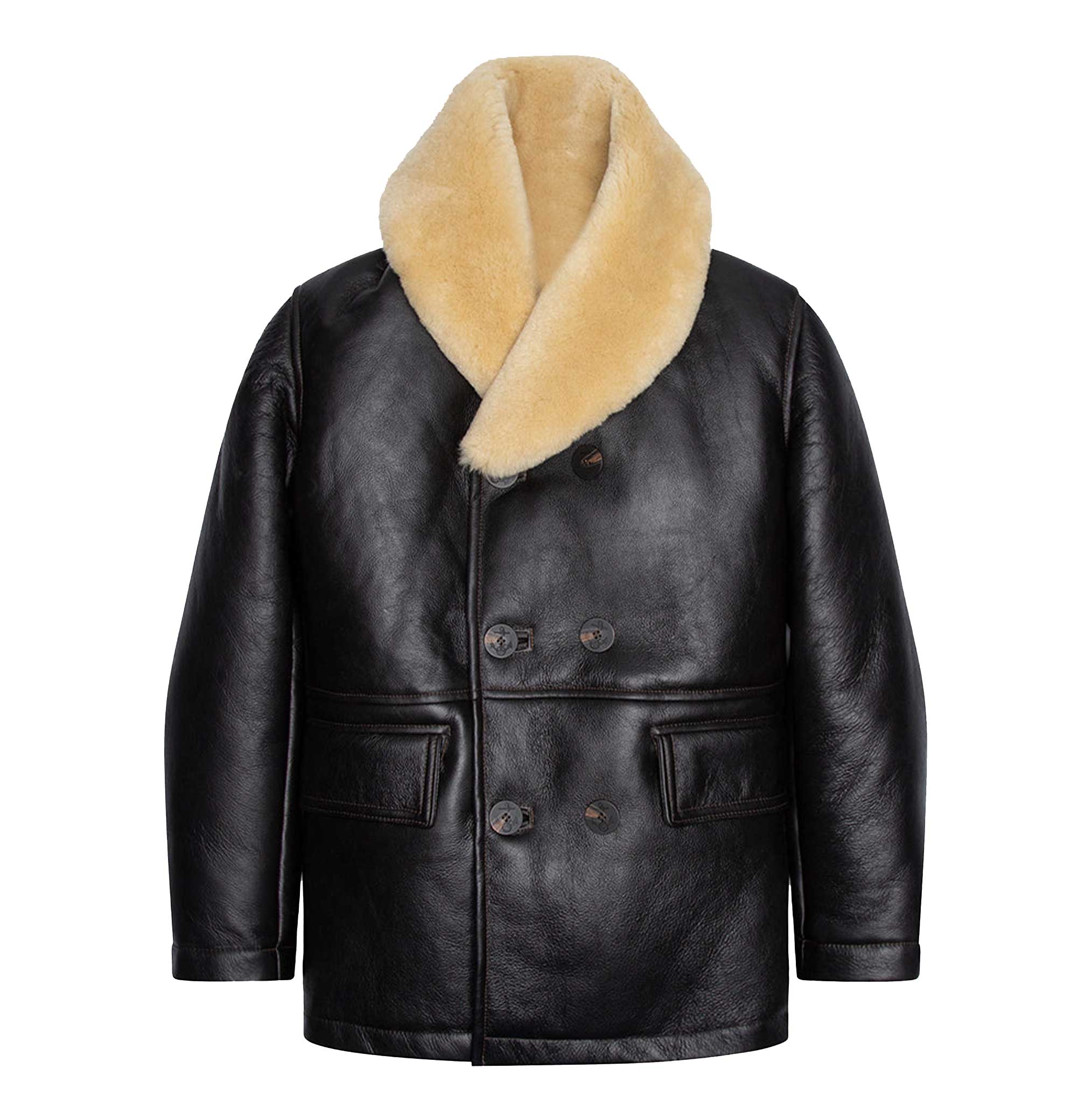 Shop the Blackstone Mac Shearling Coat – a luxury genuine leather coat with real sheepskin. Timeless WWII Mackinaw-inspired design for cold-weather style.