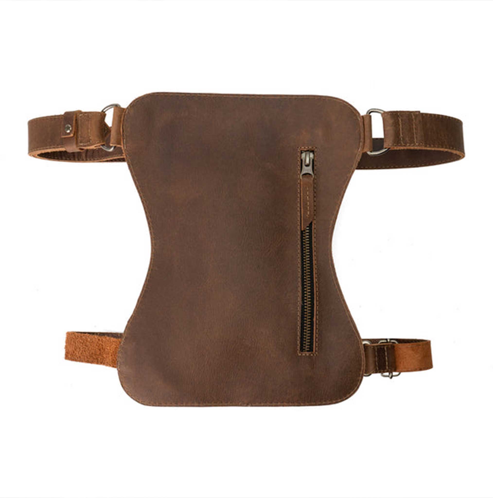 Rugged and functional brown leather leg bag for bikers. Made from full-grain leather with secure drop-leg and waist straps, multiple zip compartments, and hands-free comfort for riding, travel, and daily use.