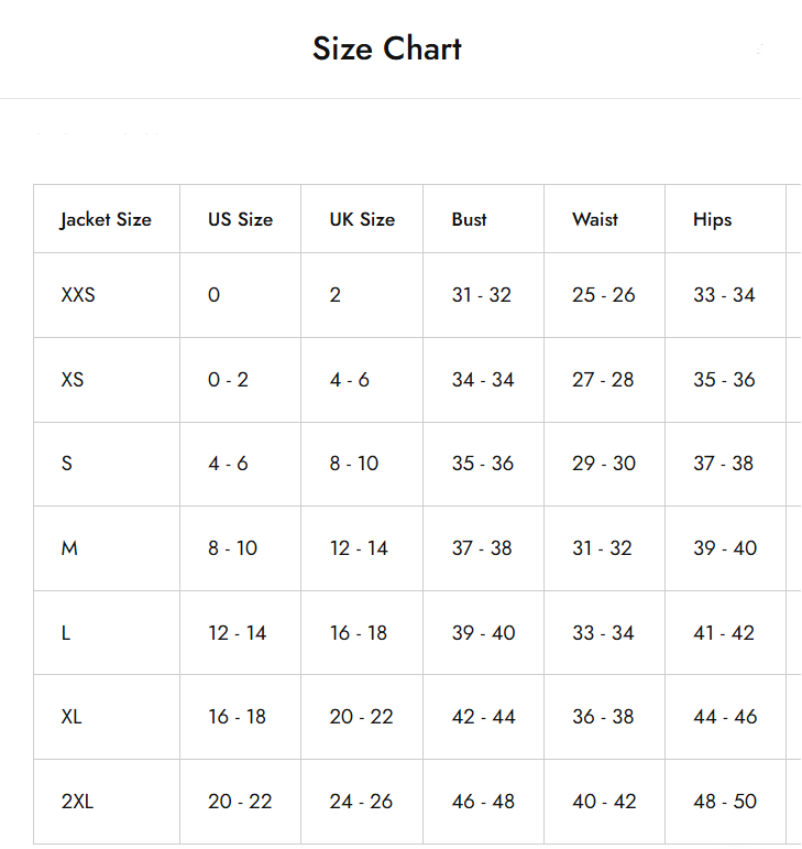 | Jacket Size | US Size | UK Size | Bust | Waist | Hips | Sleeves |