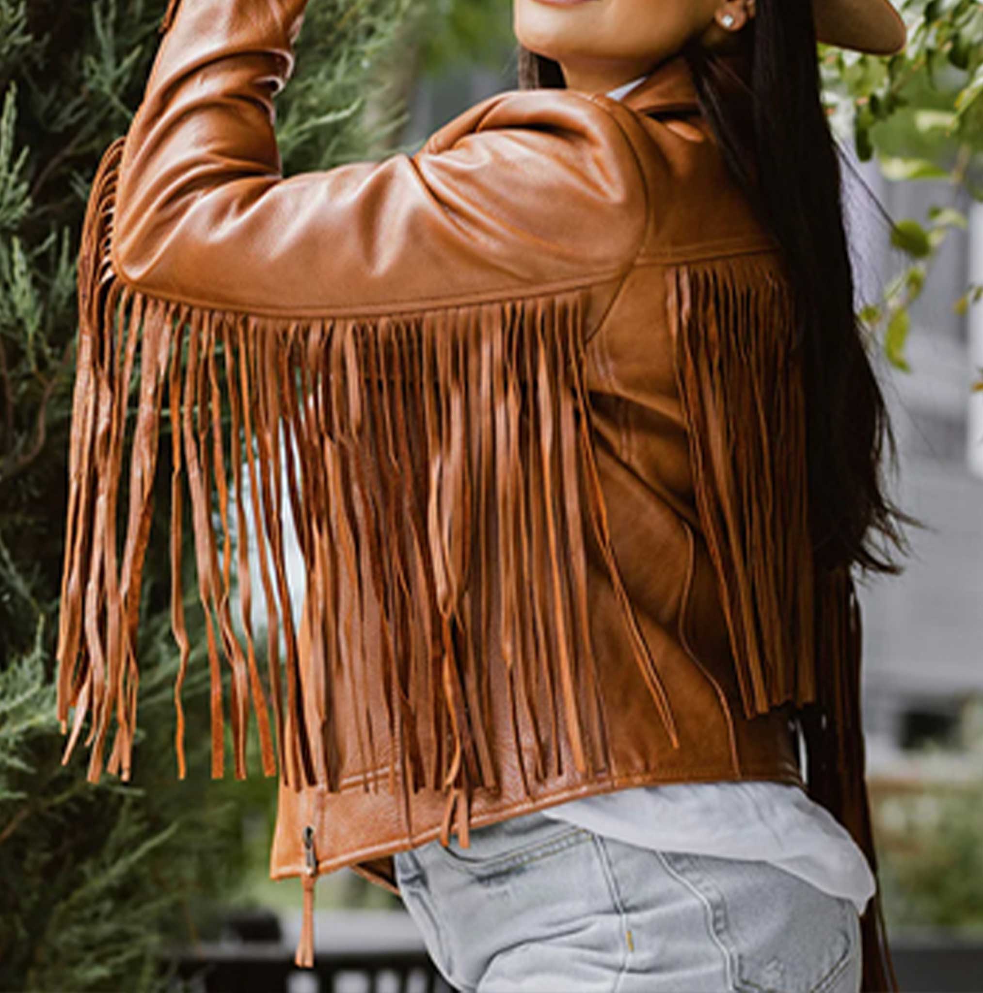 The Brown Whiskey Mesa Western Fringe Leather Jacket is designed for women who want authentic western character combined with a classic biker silhouette. Crafted from premium whiskey cowhide leather, this jacket offers durability for riding and refined style for everyday wear.