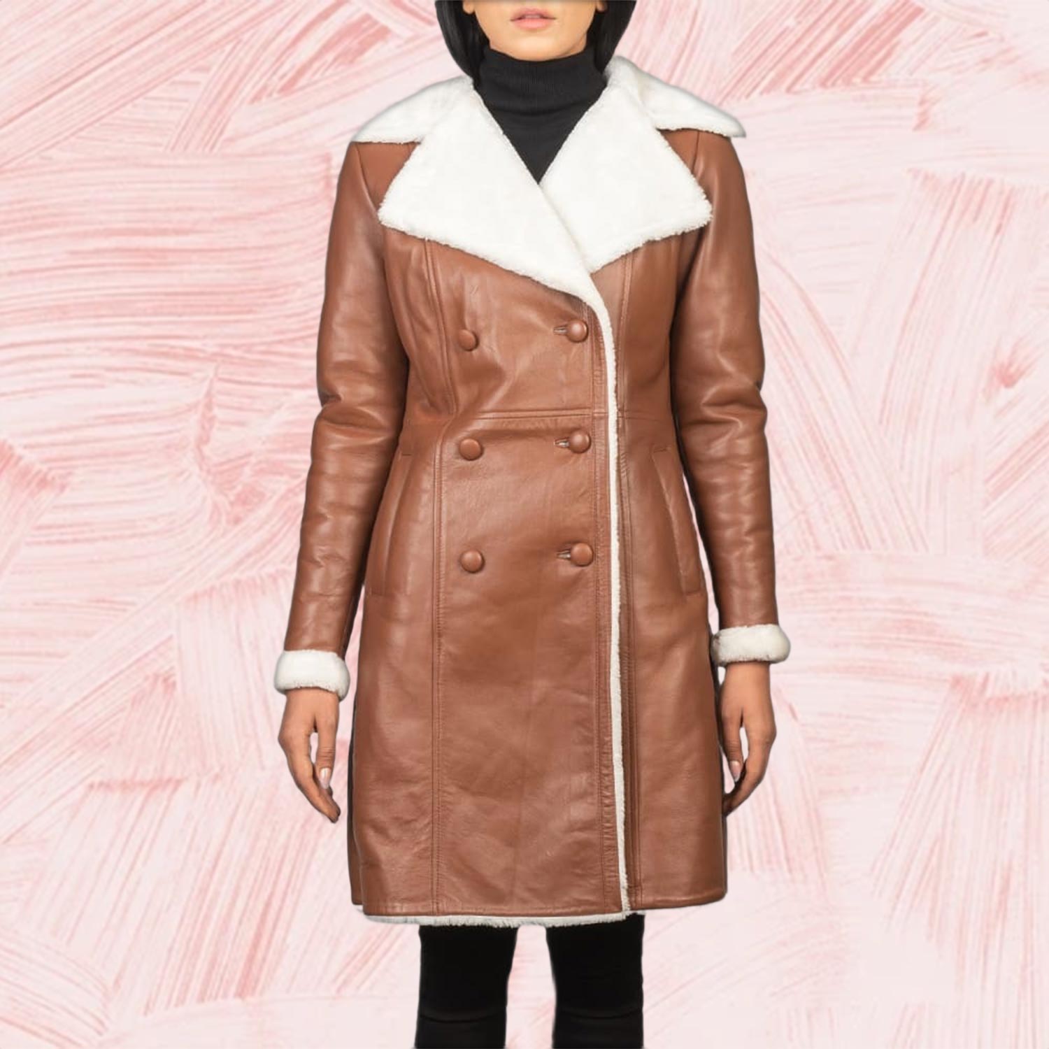 The Saltco Amie Brown Double-Breasted Shearling Coat offers luxurious warmth and timeless sophistication, crafted with premium sheepskin leather and a faux fur lining.